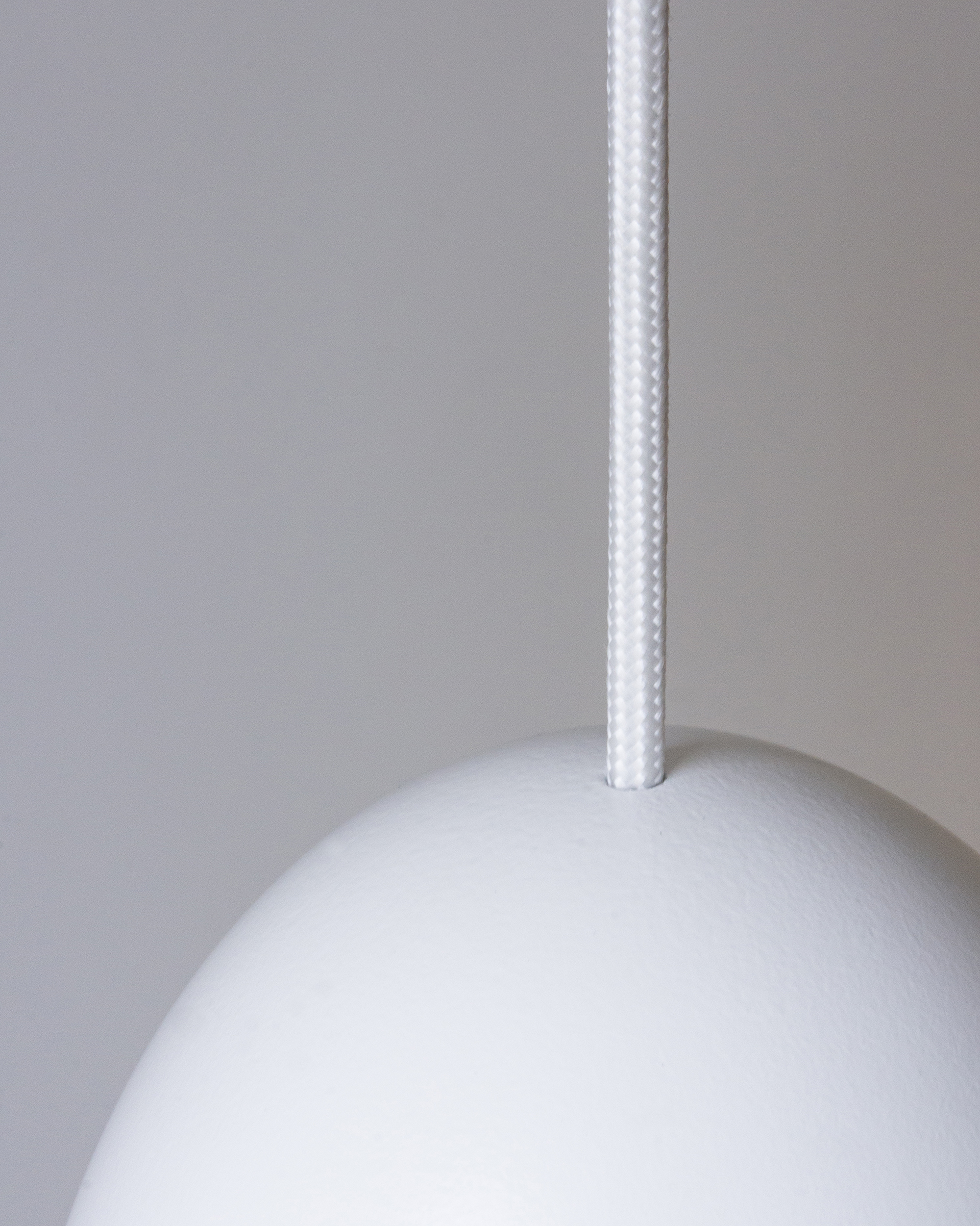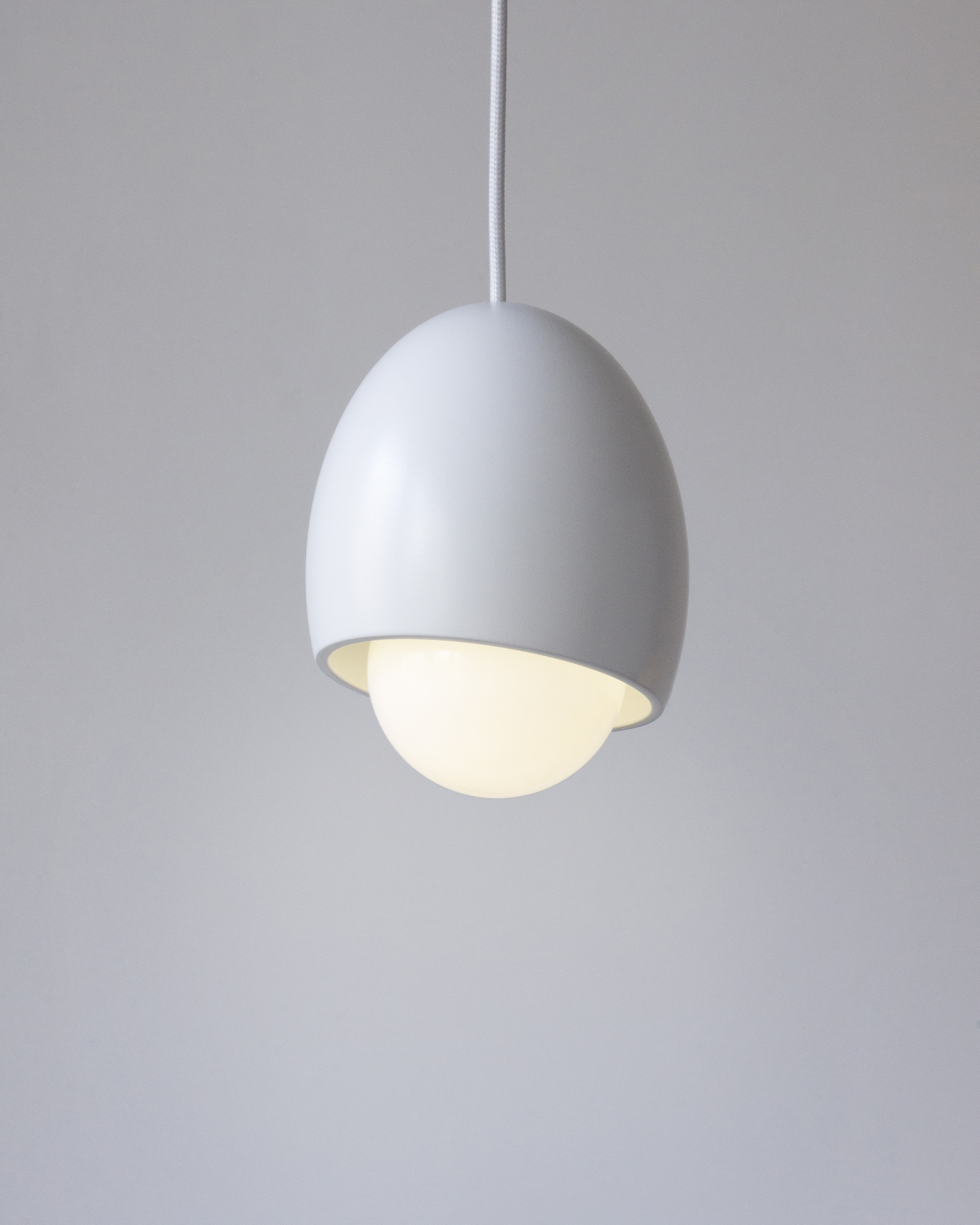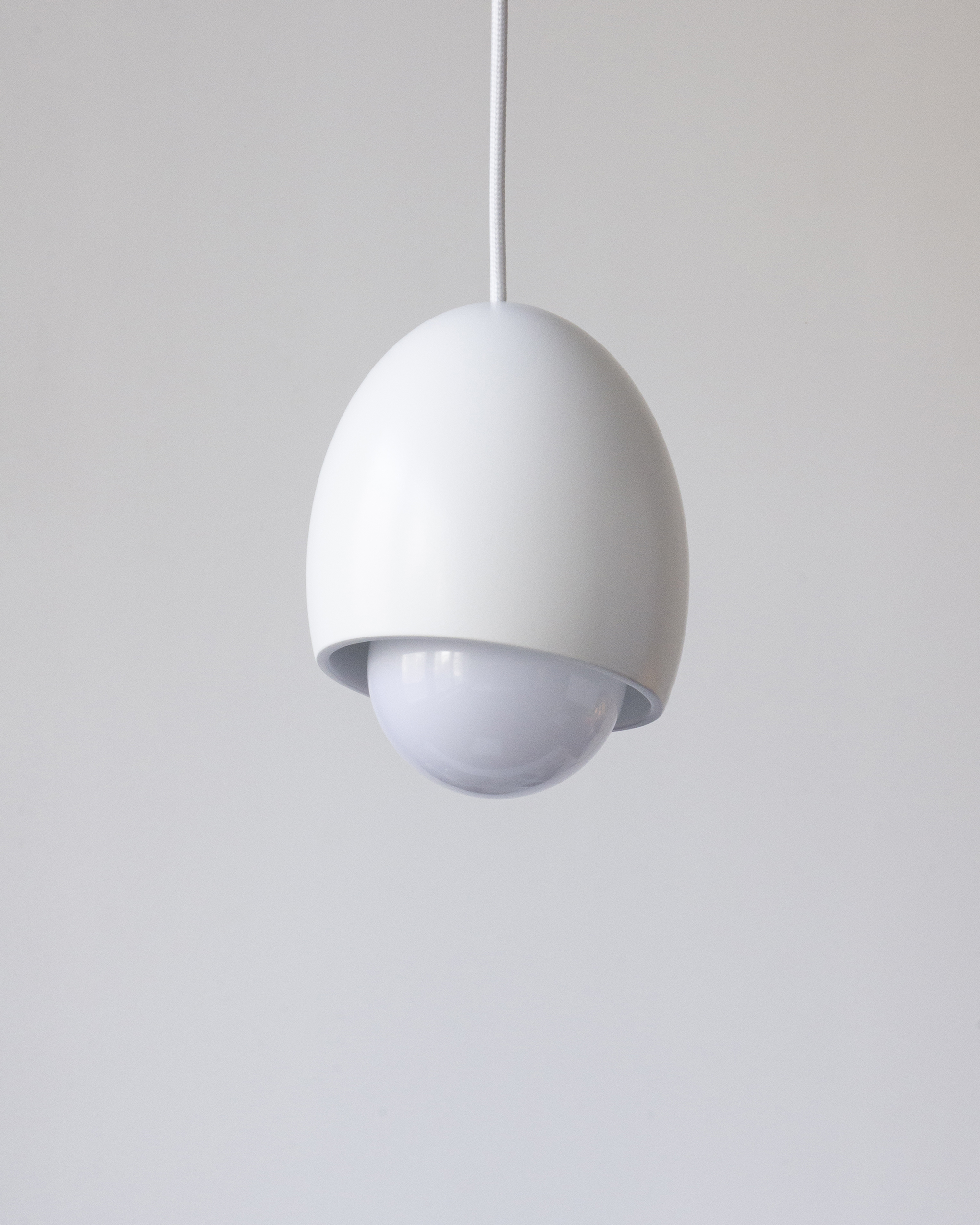 Simple egg-shaped pendant lamp. When turned on, the bulb looks like a yolk peeking out of a lampshade.